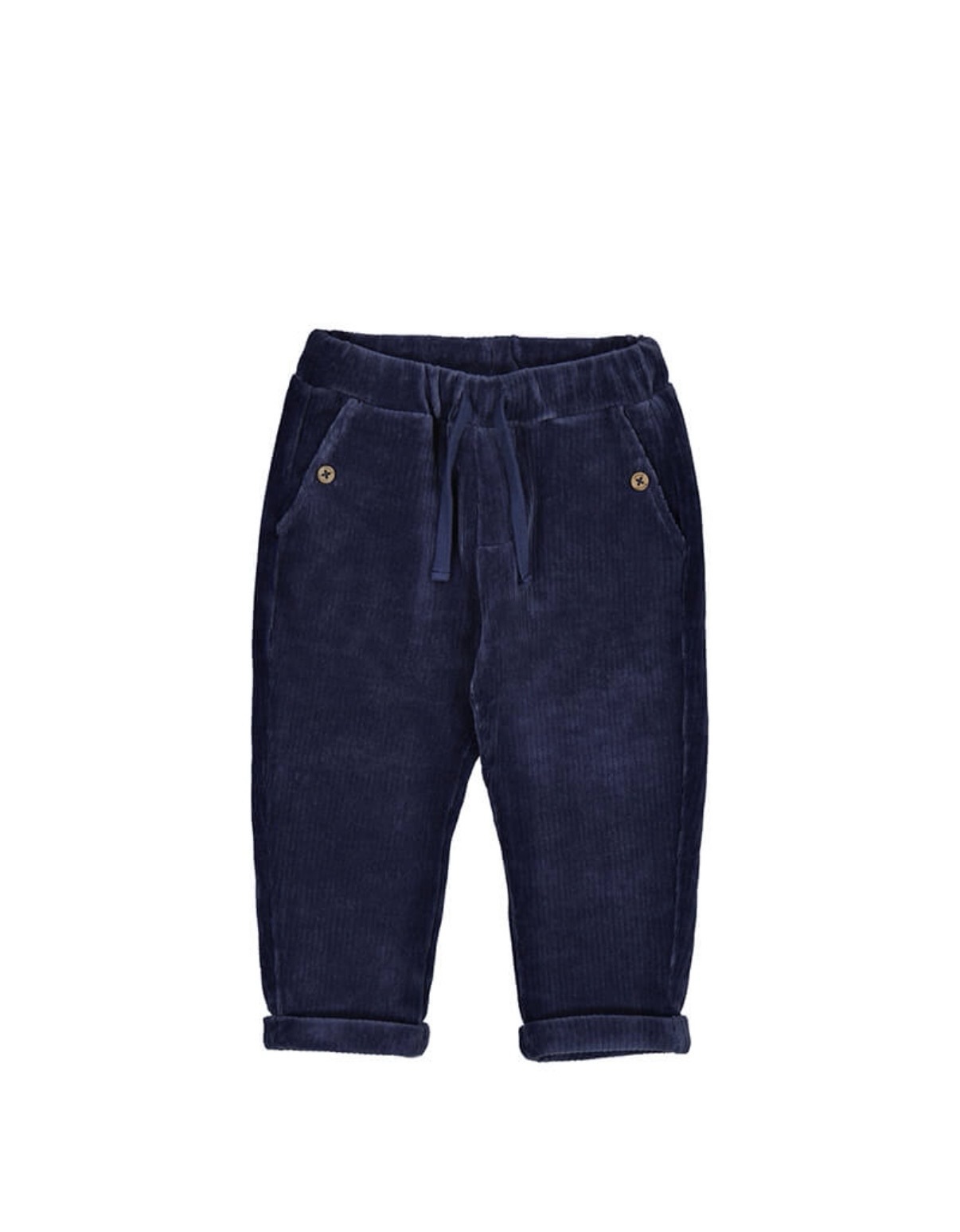 Брюки имеют прямой крой и эластичный пояс с утягивающим шнурком, что обеспечивает идеальную посадку и свободу движений. Два функциональных кармана спереди дополнены декоративными пуговицами, а низ штанин можно носить как с подворотом, так и без него.