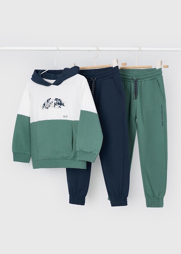 Спортивный костюм для мальчика от бренда Mayoral состоит из толстовки с капюшоном и двух пар брюк, что делает его универсальным и удобным для повседневной носки. Толстовка выполнена из мягкого и приятного материала, украшена рельефным орнаментом и шелкографическим принтом, который добавляет образу динамики и современного стиля. Спереди расположен функциональный карман-кенгуру, а капюшон защищает от ветра и прохлады.