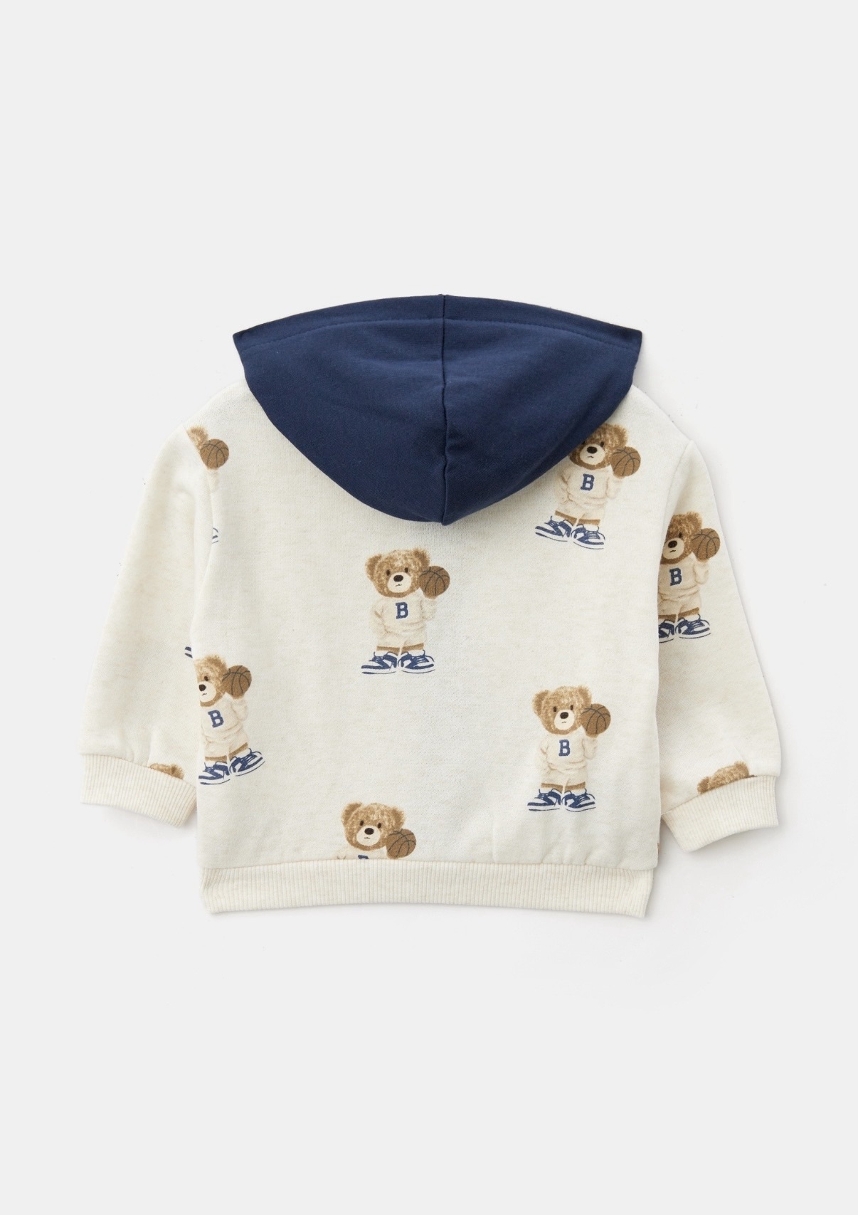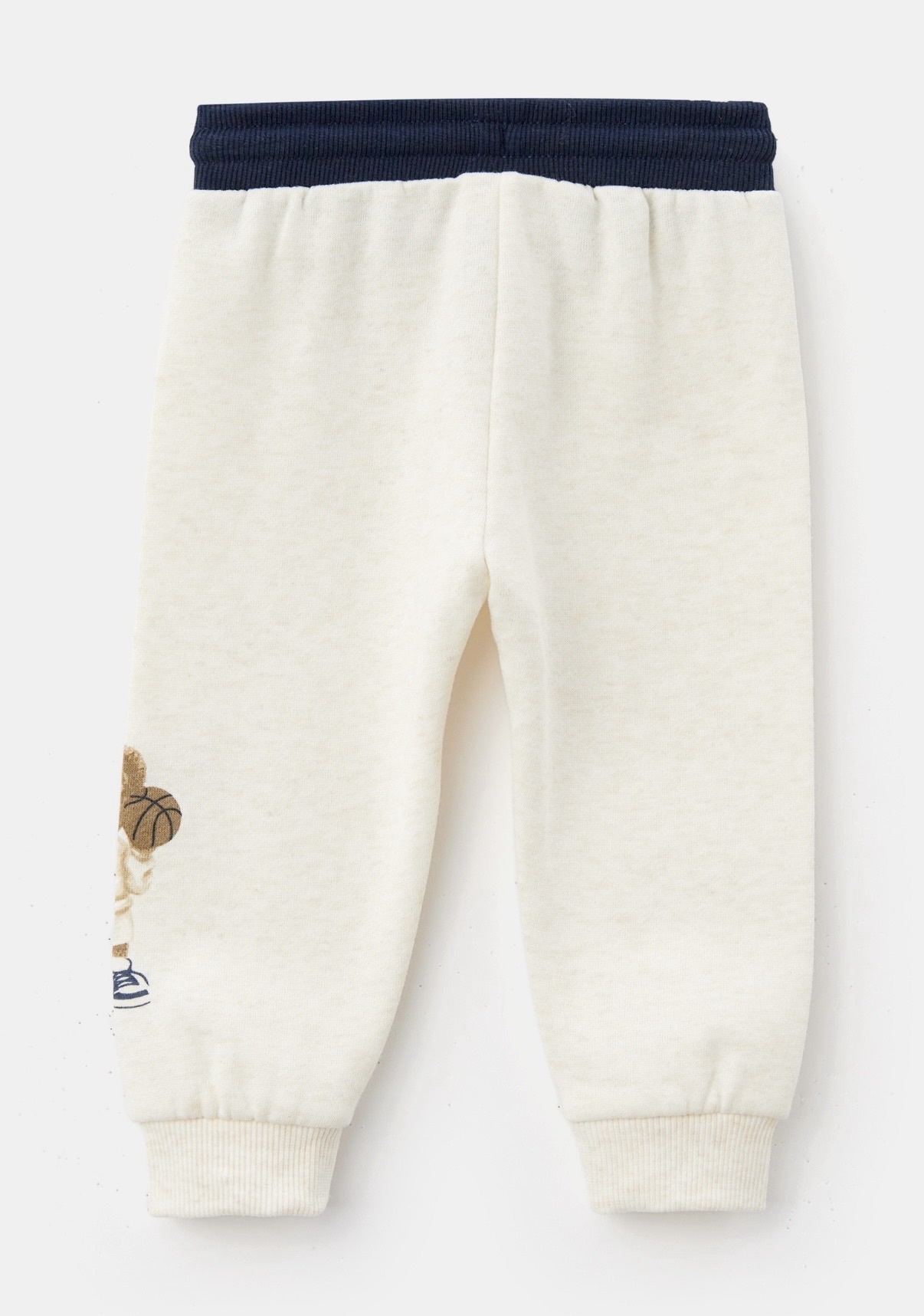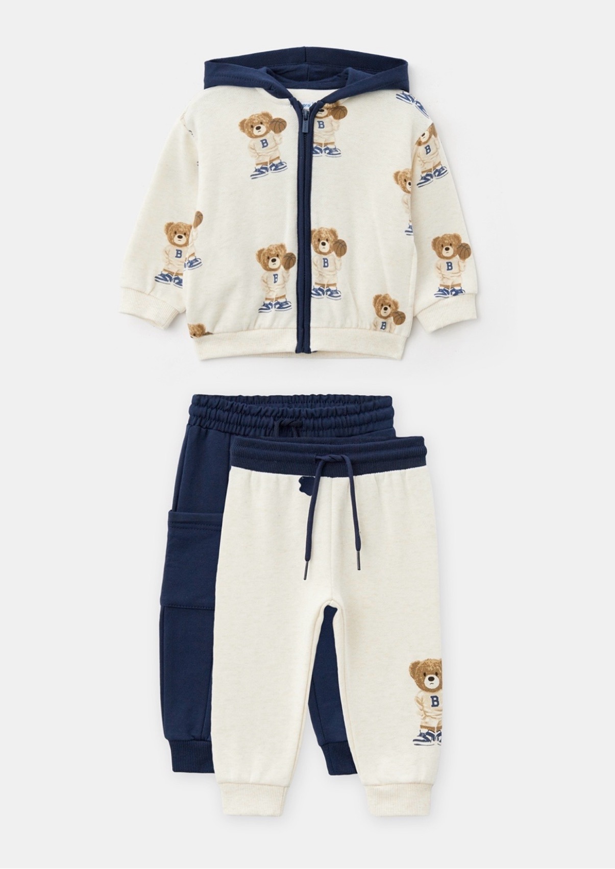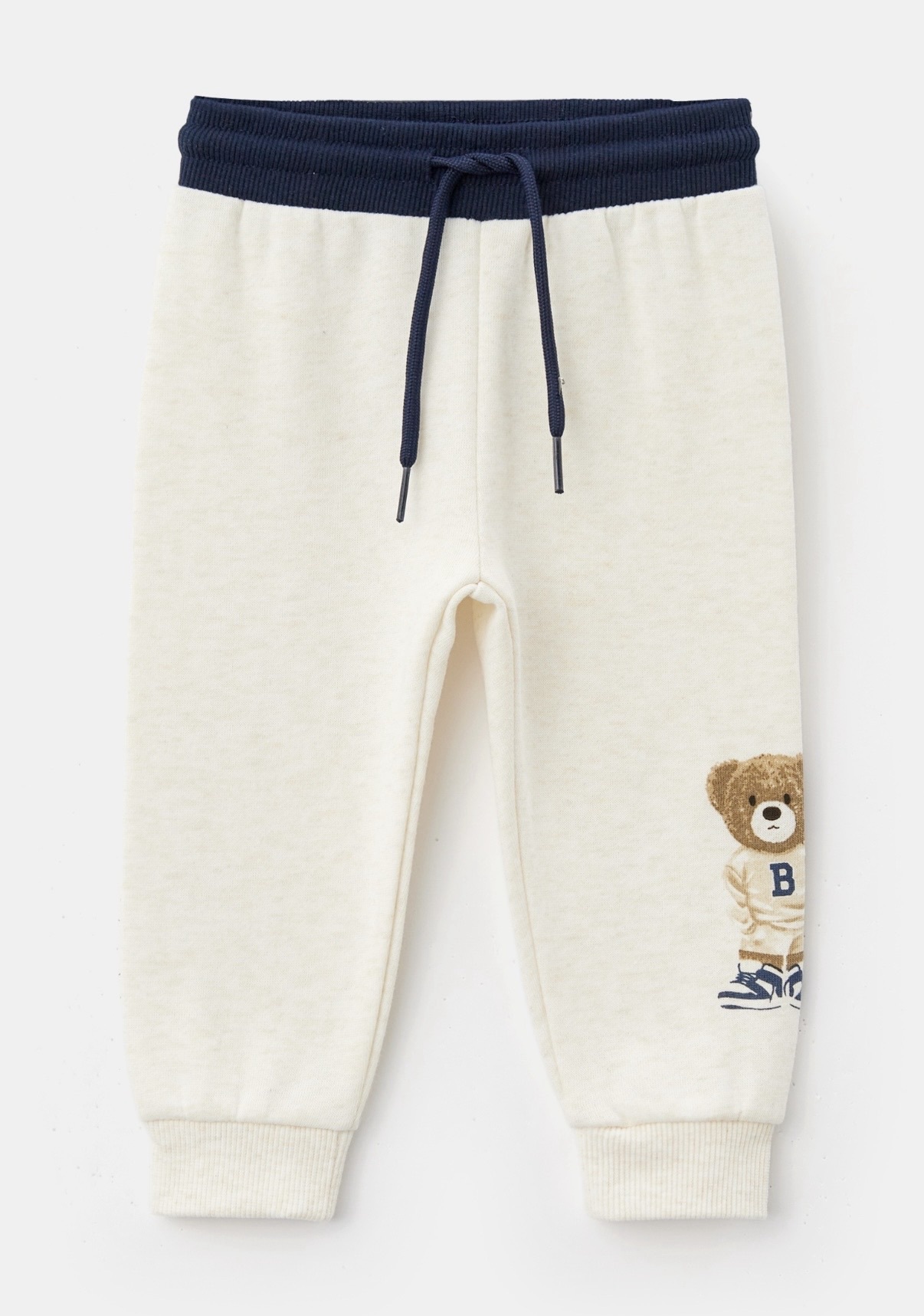 Особый акцент — рисунок медвежонка в спортивной форме, который добавляет модели детскую, но при этом стильную нотку. Материал костюма мягкий и приятный на ощупь (60% хлопок, 39% полиэстер, 1% эластан), что обеспечивает комфорт при носке и свободу движений.